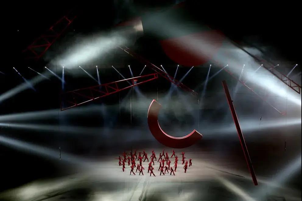 開幕式以投影為主,簡約的表演形式配上數(shù)字化和投影效果,尤其是變幻的幾何形投影,鮮艷的色彩,加上不規(guī)則舞臺,也呈現(xiàn)出震撼的舞臺效果。