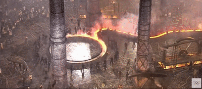 圣火盆后方有根據(jù)熱風旋轉設計的螺旋雕塑,使圣火光芒放射成太陽狀。其中主火炬塔的雕塑為動態(tài)雕塑,第二火炬塔的雕塑為靜態(tài)雕塑。