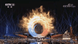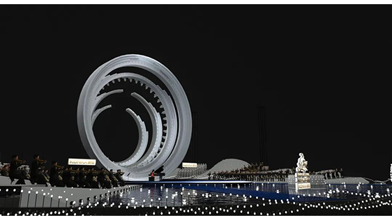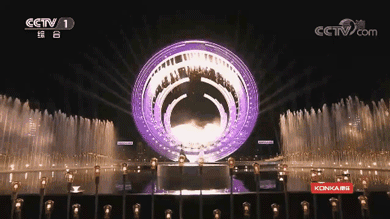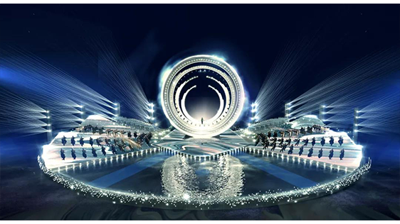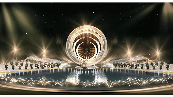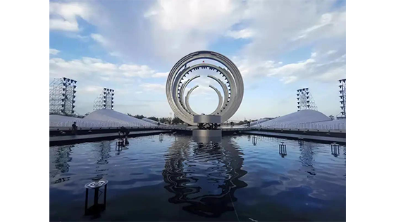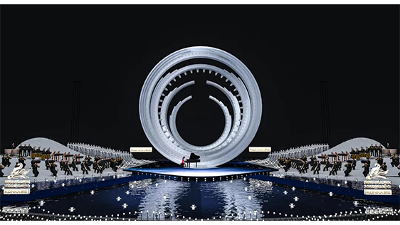 舞臺(tái)中心主體構(gòu)筑分為四組,層層展開(kāi),用簡(jiǎn)潔抽象化的海浪形式營(yíng)造表演的氛圍空間。4組直徑不等的圓環(huán)尺寸分別為直徑20m、直徑17m、直徑15m、直徑12m,主體造型上采用全鋼結(jié)構(gòu)形式搭建而成。圓環(huán)上吊掛燈光、水簾、冷焰火等設(shè)備,總體重量約100噸。