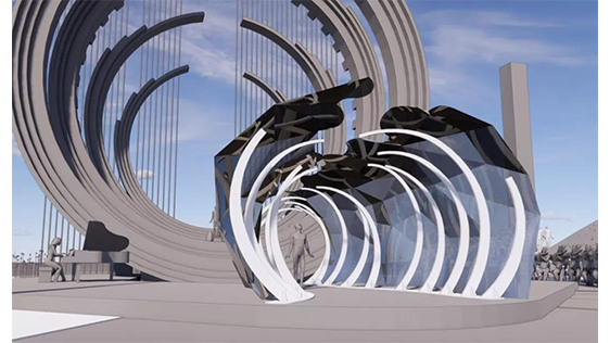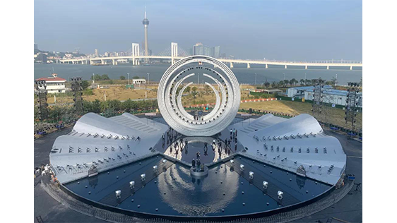 整體舞美由主舞臺(tái)和IFC樓頂停機(jī)坪舞臺(tái)兩部分組成,主舞臺(tái)以揚(yáng)帆遠(yuǎn)航,乘風(fēng)破浪為概念,場(chǎng)地選擇面向珠海橫琴核心地標(biāo)IFC國(guó)際金融中心大廈。背靠大海,隔海相望澳門,舞臺(tái)中心構(gòu)筑物造型簡(jiǎn)潔化,一珠入海激起千層浪的主體結(jié)構(gòu)元素處理讓城市夜景做為舞美設(shè)計(jì)的天然主背景,展現(xiàn)大灣區(qū)“共同家園”的美好景象。