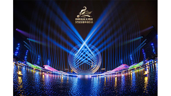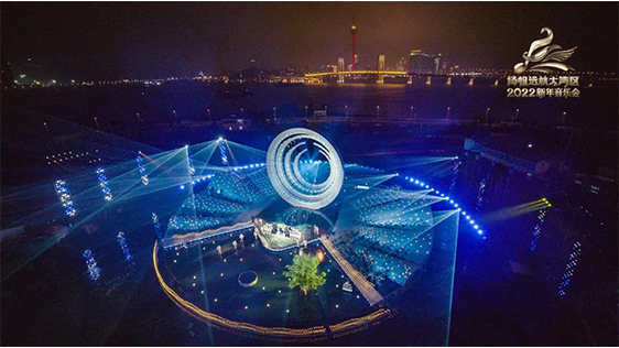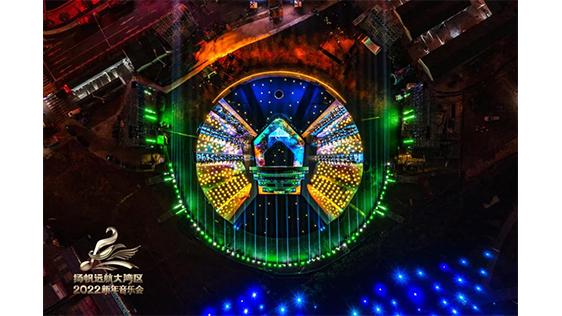 舞臺(tái)主體視覺(jué)以去舞臺(tái)化的概念為出發(fā)點(diǎn),將舞美空間視覺(jué)方向朝城市景觀和裝置融合設(shè)計(jì),滿足晚會(huì)功能性同時(shí),也可作為城市景觀的一部分存在,賦予舞美多重的功能性。在光影渲染下,2022新年音樂(lè)會(huì)在新年第一天,深刻詮釋出大灣區(qū)“勇立潮頭敢為先,奮楫揚(yáng)帆謀新篇”的恢宏氣勢(shì)。