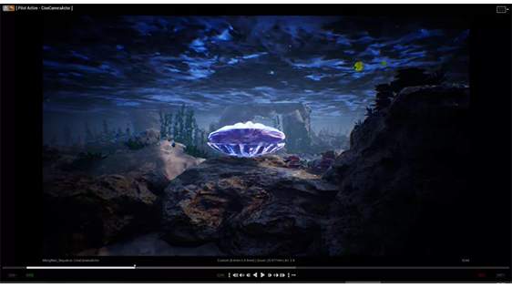 歌曲《夢(mèng)灣》采用虛擬技術(shù),在虛實(shí)結(jié)合中做了一場(chǎng)充滿想象的海底美夢(mèng)。通過(guò)實(shí)時(shí)采集攝像機(jī)畫面和摳像遮罩的實(shí)時(shí)運(yùn)用,將舞臺(tái)區(qū)域獨(dú)立出來(lái),置身于海底世界的貝殼中。隨著虛擬攝像機(jī)的運(yùn)鏡,海底貝殼緩慢打開(kāi),實(shí)景舞臺(tái)逐漸顯現(xiàn),虛擬環(huán)境周圍光源逐漸加強(qiáng),烘托了節(jié)目整體氛圍,表達(dá)了美好寓意。