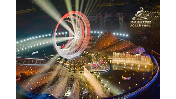主舞臺(tái)的燈光布局在舞美結(jié)構(gòu)造型的基礎(chǔ)上,采用珠"圓”的環(huán)形設(shè)置表達(dá)美滿、地區(qū)融合的合家歡概念。以簡(jiǎn)潔、去舞臺(tái)化的構(gòu)思進(jìn)行燈位的布局,對(duì)舞美主體采用了外投燈具染色、外頭激光勾勒以及內(nèi)置燈具等燈光處理手段,用燈光去呈現(xiàn)大氣、干凈的視覺(jué)感受。
