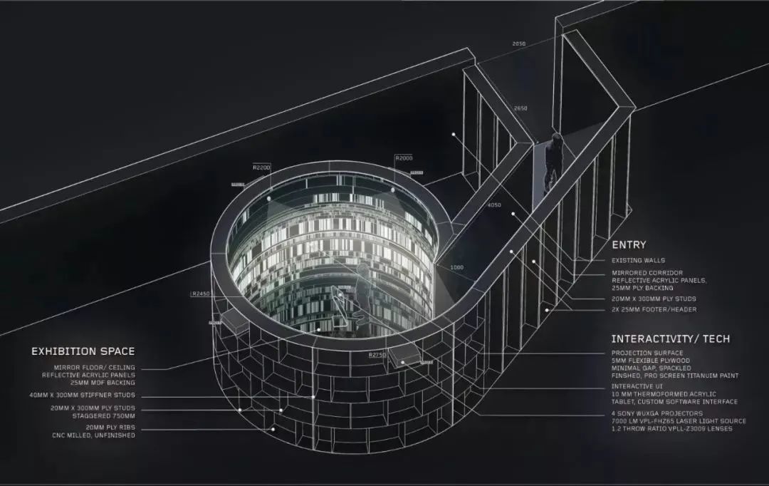 使用四臺投影機進行投影,配上類似囈語的配樂,把觀眾包裹進這虛幻的空間。
