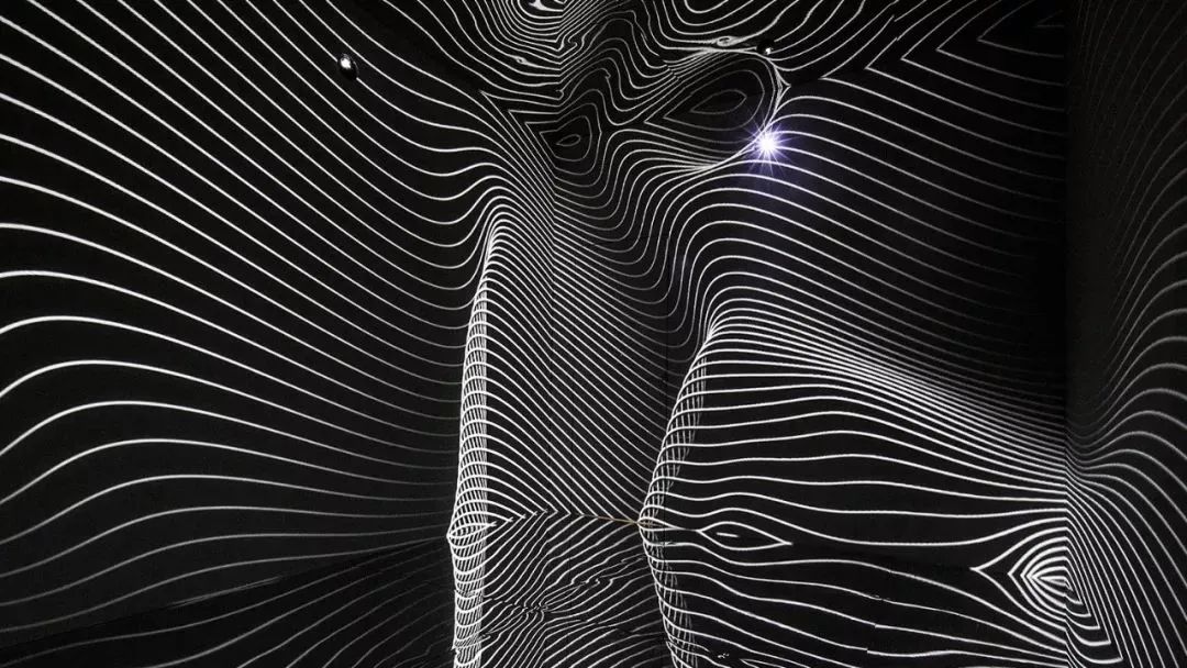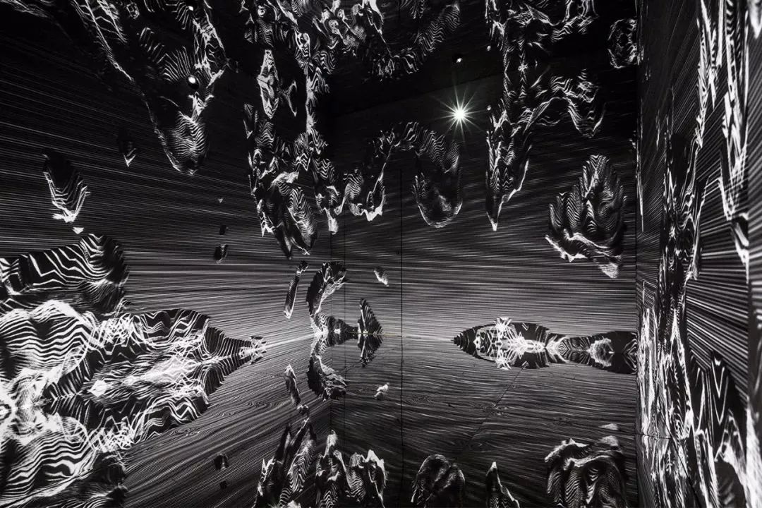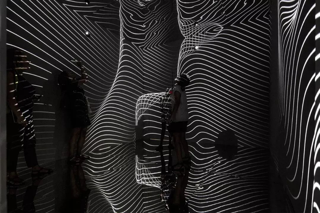 黑白基調(diào)的11分鐘投影包括螺旋線條、黑洞、枯山水似的動態(tài)圖像,仿佛一個鏡面版的時空隧道。