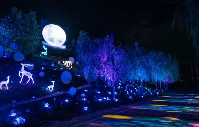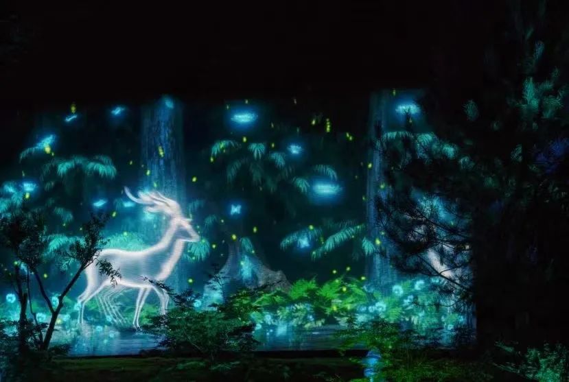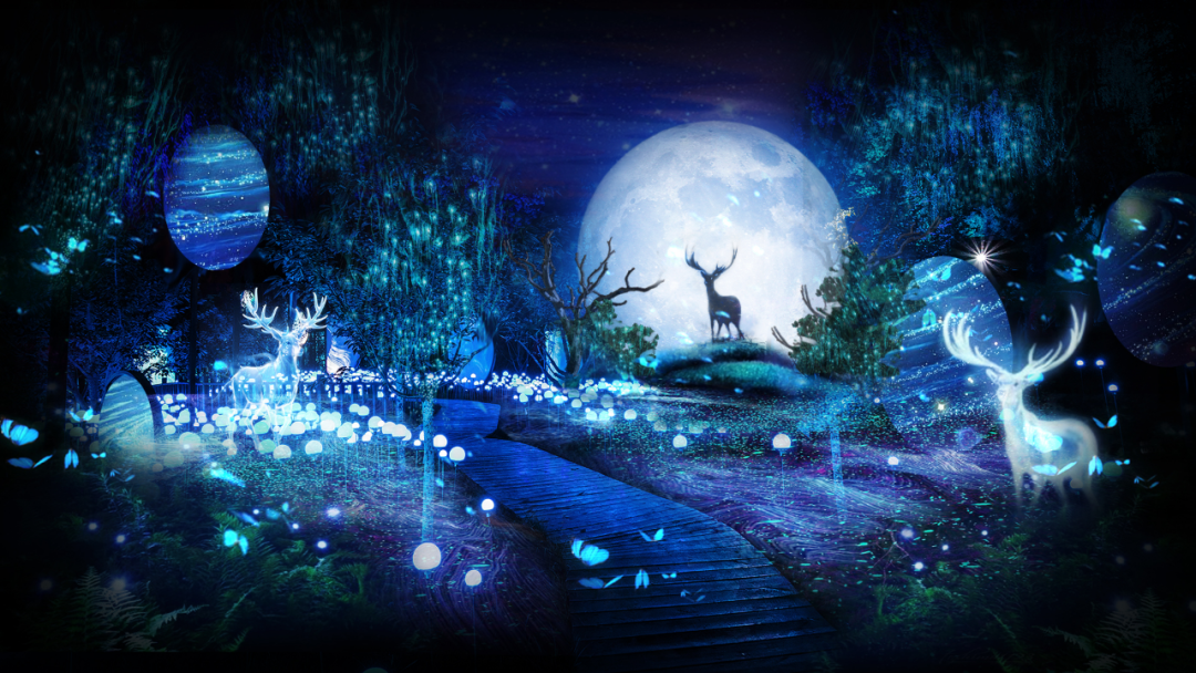 《夜譚·白鹿原》依托白鹿原影視城的自然風(fēng)貌以及陳忠實(shí)小說《白鹿原》進(jìn)行藝術(shù)創(chuàng)作,以白鹿、仙草、愛情、家國為核心元素,由入境尋光、鹿林仙境、月下鹿影、仙草叢林、神鹿降世、月下斑斕、白鹿生靈、云端夢境、蝶戀紛飛、叢蔭尋影、星途喚月、家國大愛、白鹿化仙十三個(gè)分區(qū)場景貫穿而成。