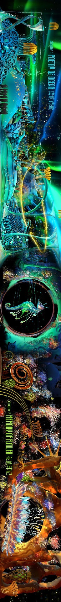 在空無一物的空間里,粒子以獨(dú)特的形式擴(kuò)散開來,這是生命的起點(diǎn)。生命源自于深邃而神秘的海洋。伴隨著藍(lán)鯨的聲波、海龜?shù)母∮?、水母的微?dòng),生命的延續(xù)在其間展開。極具標(biāo)志性的浮游式的藝術(shù)影像和意識(shí)流式的海洋中的聲音相生相伴,共同構(gòu)成一幕關(guān)于“海的詩歌”劇場。