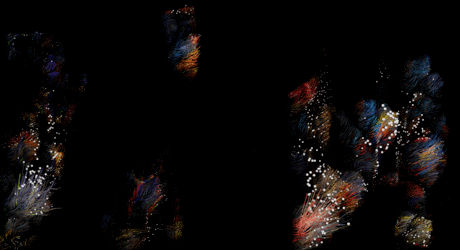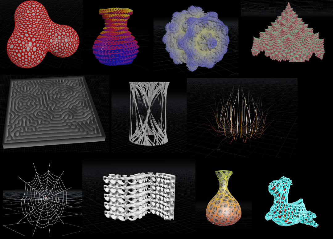 這部作品整體并非傳統(tǒng)的偏寫實(shí)的Mapping風(fēng)格,使用了大量的抽象表達(dá)。所以根據(jù)創(chuàng)作的需要,負(fù)責(zé)視覺技術(shù)的設(shè)計(jì)師需要自行研發(fā)出很多非常規(guī)的特效和表現(xiàn)手段,用寫意的手法來對(duì)畫面中所要表達(dá)的元素進(jìn)行解構(gòu)和重構(gòu)。下面是設(shè)計(jì)師用Houdini設(shè)計(jì)出的很多測試效果,很多效果在最終的成片中并未展現(xiàn)出來,但是依然凝聚了創(chuàng)作團(tuán)隊(duì)的心血。