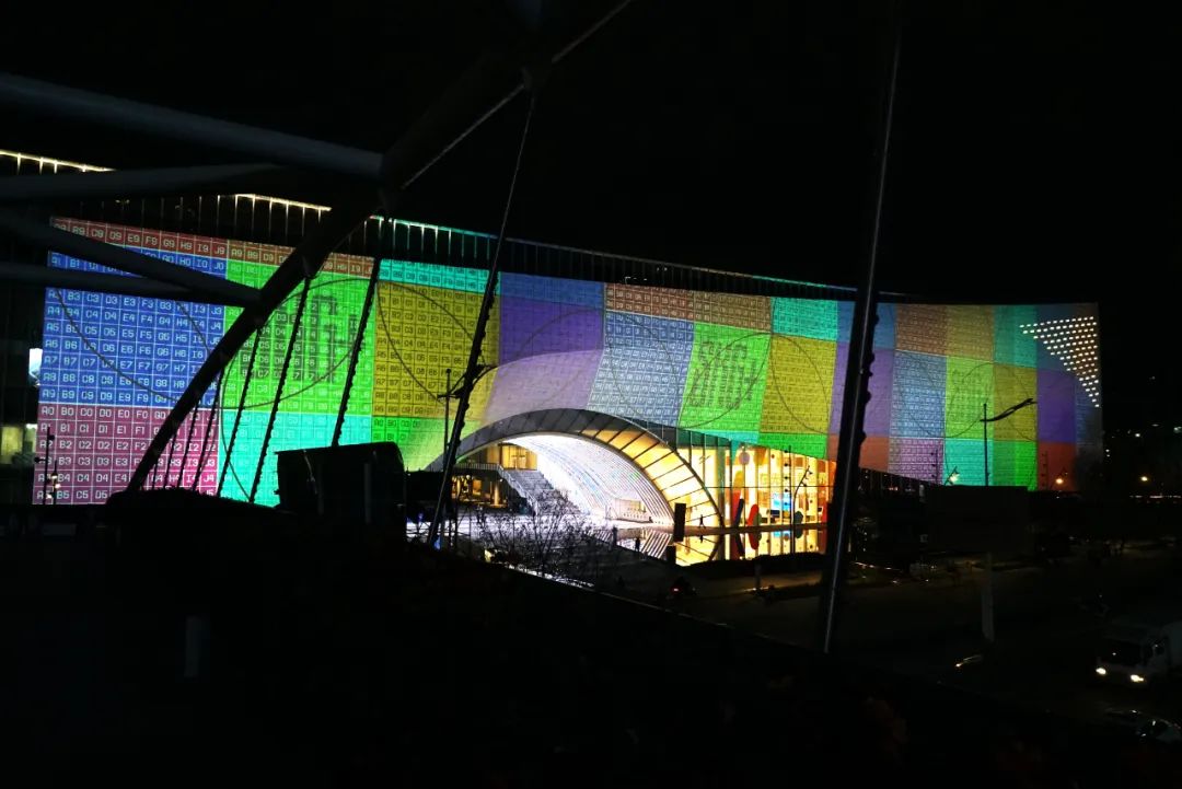 這座建筑長約170米,高約35米,通體是純白色的特殊材料鋼板和玻璃幕墻制成,再加上建筑前的一座水池可以完美地倒影出建筑的形象,是一座非常適合光影秀創(chuàng)作的載體。
