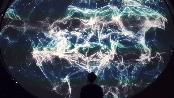 開幕展覽是有著人工智能先驅(qū)之稱的土耳其藝術(shù)家 Refik Anadol 的《Machine Memoirs: Space》,以及倫敦沉浸式藝術(shù)先驅(qū) Marshmallow Laser Feast 的五屏實(shí)時互動裝置《The Tides Within Us》。