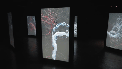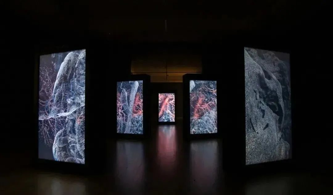 作為 Marshmallow Laser Feast 不斷探索超越我們感官極限的世界的一部分,五屏實(shí)時互動裝置《The Tides Within Us》研究了氧氣在心血管系統(tǒng)中的流動,將人體描繪成一個流動的事件,更像一個漩渦,而不是一個靜止的物體。