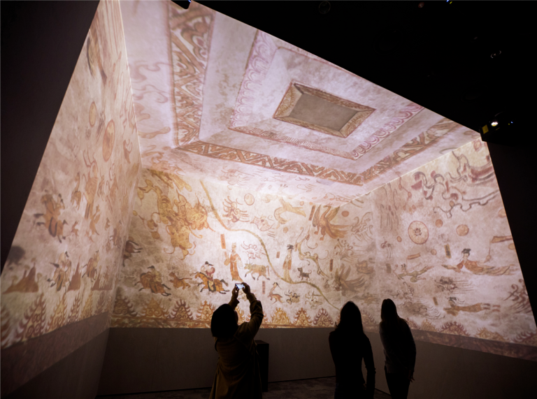 3D數(shù)字影像從四面(前墻、左右墻和天花板)投影,再現(xiàn)了高句麗古墓的壁畫,仿佛站在真正的陵墓內(nèi)。