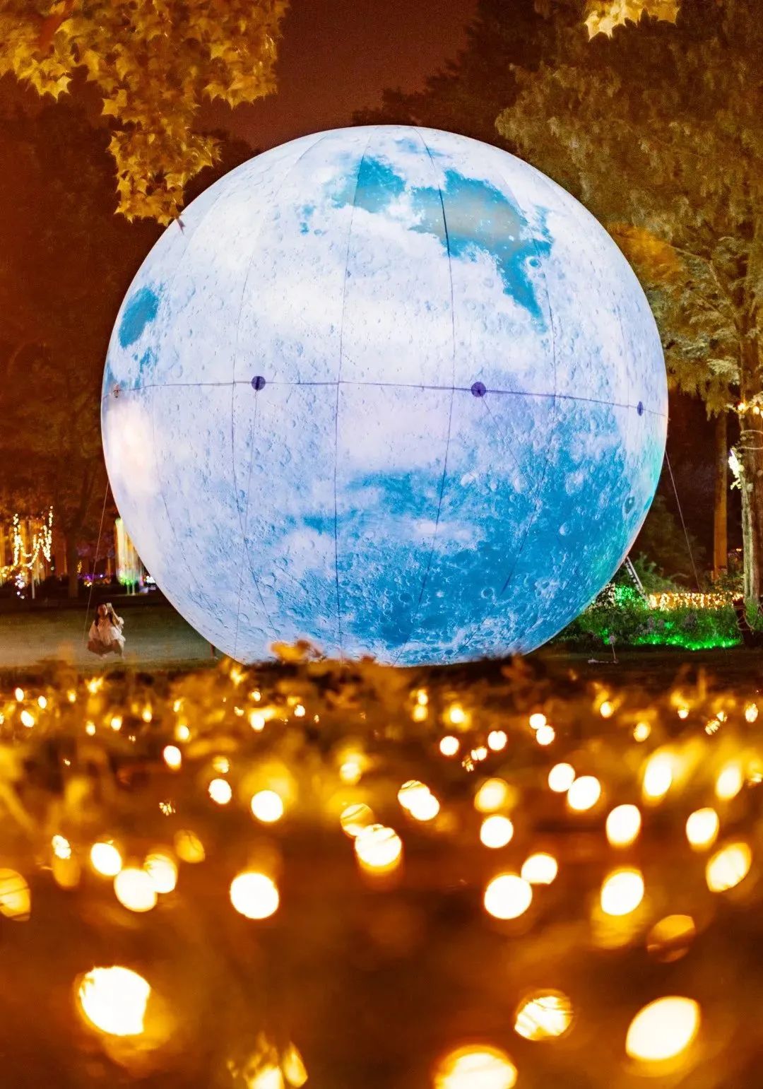 百米行星夢(mèng)幻長(zhǎng)廊最為耀眼奪目。中心草坪旁的樟樹(shù)大道化身美輪美奐的星空長(zhǎng)廊,800組藍(lán)色燈串編織成蔚藍(lán)天幕,200個(gè)星球在空中串聯(lián)成璀璨星河,大小各異的行星參差錯(cuò)落分布,絢爛無(wú)邊,人在“星河”下行走猶如太空漫步。