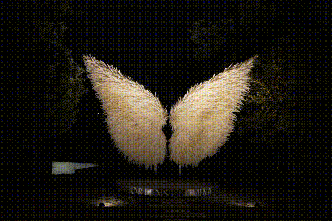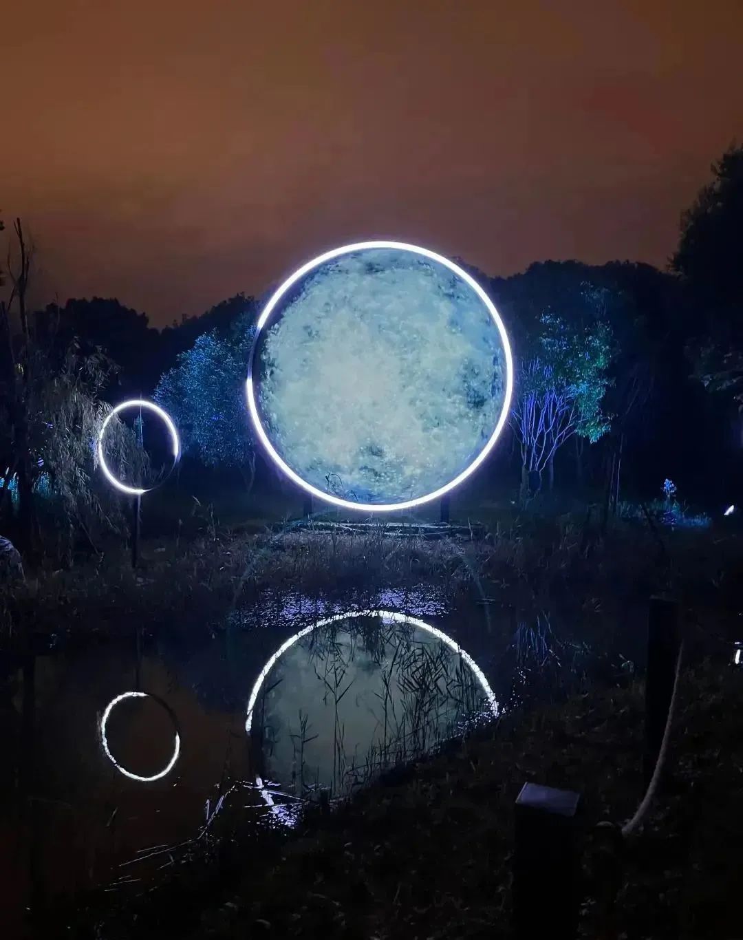 中心草坪上,一輪碩大的圓月輕吻草地,月波清霽,浪漫滿分。充滿科技感的天使之翼光影閃爍,十分吸睛。幾個(gè)纖長(zhǎng)明亮的光纖簾佇立在草地上,有“火樹(shù)銀花”之感。
