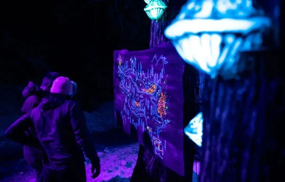 游客到達(dá)Shooting Stars區(qū)域時(shí),無(wú)數(shù)的鐳射光投影在樹(shù)葉、樹(shù)干與流水之上,營(yíng)造了星星降落于身邊的奇幻之感,仿佛置身于不同的時(shí)空;游客越過(guò)一座橋,橋邊有會(huì)說(shuō)話的樹(shù)木,一切宛如魔法;還有篝火歌曲的吟唱等等。游客游覽的提示還隱藏在森林的海報(bào)和神秘的無(wú)線電信號(hào)中。