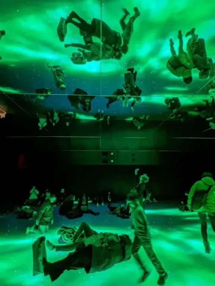 當(dāng)觀眾進(jìn)入北極光的場域,被極光包裹著,感受極光帶來的樂趣。這些流動(dòng)的北極光變幻著不同的顏色和形狀,近距離的接觸北極光。當(dāng)觀眾躺在地上,靜靜地聆聽北極光發(fā)出的聲音。