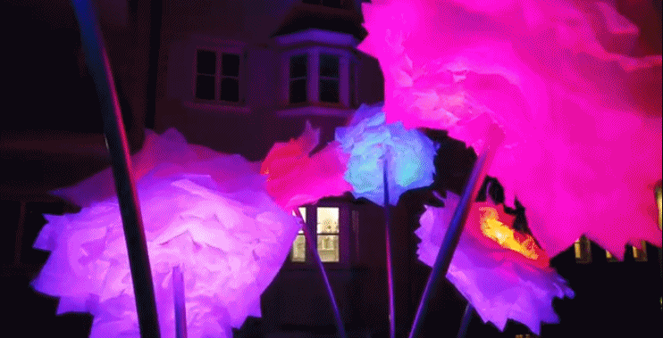 水燈節(jié)用燈光照亮布里克森,兼具奧地利、德國(guó)南部建筑風(fēng)格的小鎮(zhèn)房屋和教堂披上了光影的外衣。藝術(shù)家精心制作的裝置似孔雀開(kāi)屏,如夜間飛行的蝙蝠,像漂浮的海帶。