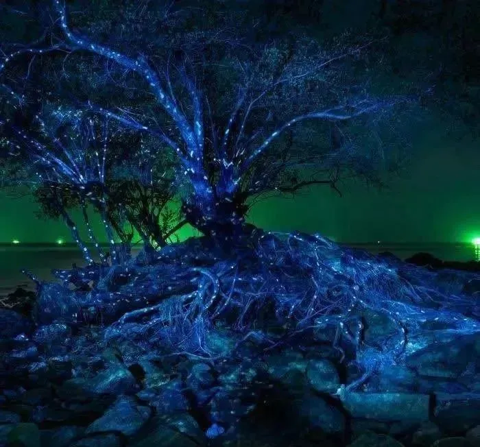同時(shí),周?chē)臉?shù)木也被各式的燈光裝點(diǎn),隨著音符跳動(dòng),展開(kāi)一場(chǎng)流光溢彩的燈光秀。