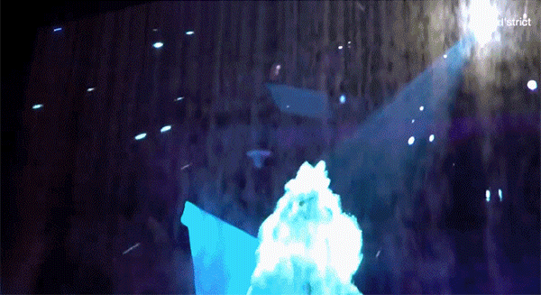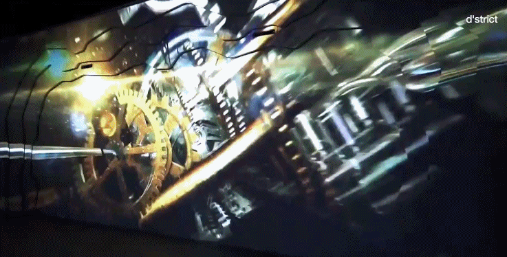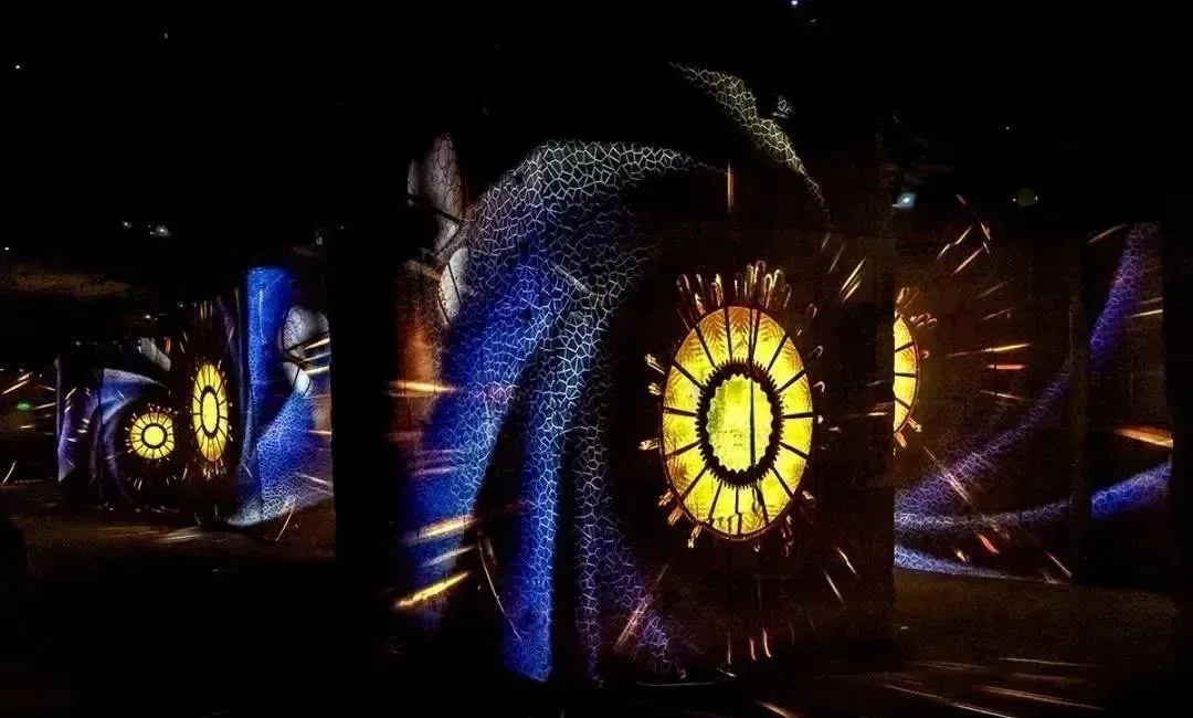 沉浸在其中仿佛置身烏托邦的建筑世界。燈光與投影交互影響,建筑的雙曲線拱頂、柱子、連綿起伏的墻壁立體的展現(xiàn)在眼前。