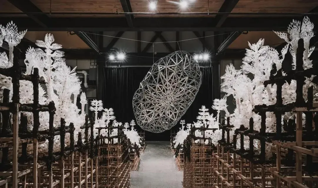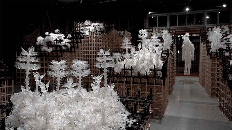 《地心引力的寓言》將觀眾包裹在一個(gè)超凡脫俗的動(dòng)態(tài)景觀中,這種景觀似乎源于一系列搖搖欲墜的木架子,當(dāng)觀眾進(jìn)入裝置時(shí),會(huì)完全沉浸在盛開(kāi)的植物叢中,充滿異國(guó)情調(diào)的交響樂(lè)在房間嬉戲地彈跳。