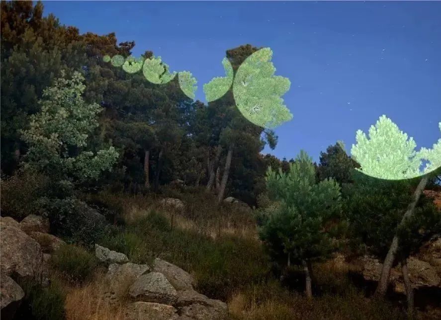 西班牙藝術(shù)家Javier Riera將光束投射到各種自然景觀上,創(chuàng)作出一系列特定樹形的幾何光線投影,藝術(shù)家通過該作品可以加深觀眾和大自然的聯(lián)系。