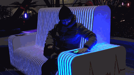 “Vena Lumen”的意思是脈沖光,在這個(gè)令人驚嘆的長(zhǎng)凳上坐下,將手放在傳感器上,觀察它將你的心跳變成舞動(dòng)的燈光。展示了兩種生命碰撞并結(jié)合在一起,彼此成為一體。