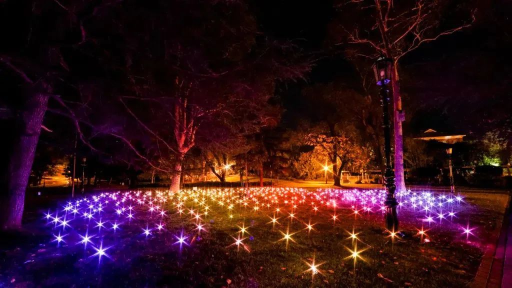 本迪戈是該州最適合天文愛(ài)好者的景點(diǎn)之一。夜晚,游客們?cè)诖四軌驈氐追潘?,盡情享受這片寧?kù)o的澳大利亞南部天空,透過(guò)羅莎琳德公園樹(shù)梢的閃耀景象觀賞星空。這次的藝術(shù)裝置同樣也安排了類(lèi)似星空的燈光秀。