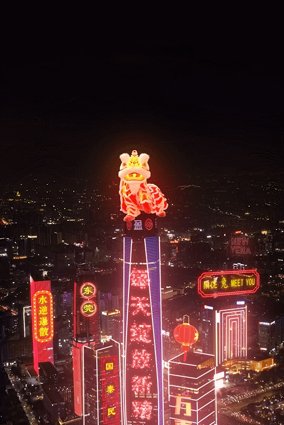 象征著新年的醒獅,在東莞各座樓宇間跳躍舞動(dòng),紅色條幅徐徐展開,絢麗煙火齊齊綻放,為大家送上新年祝福。