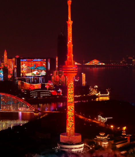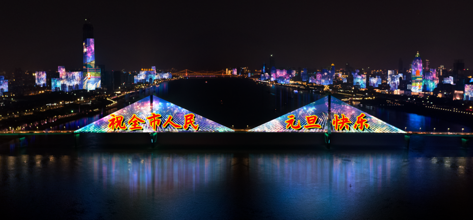 武漢兩江四岸沿線約25公里的建筑、橋體、山體和躉船碼頭被點(diǎn)亮,濃濃的新年年味撲面而來,新年的喜慶氛圍滿溢而出。