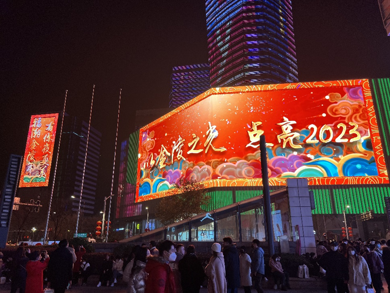 2023年1月1日0點(diǎn),南京新街口跨年燈光秀準(zhǔn)時(shí)點(diǎn)亮金陵城。當(dāng)晚,大屏絢麗多彩的光影跨年首秀,為南京市民送上新年祝福,帶來奇幻奪目的視覺藝術(shù)體驗(yàn),吸引大家駐足觀賞、打卡拍照。隨著燈光秀畫面的變化,大家沉浸在斑斕的光影盛宴中,璀璨的燈光也點(diǎn)亮了新一年的希望,承載著對(duì)美好生活的向往。