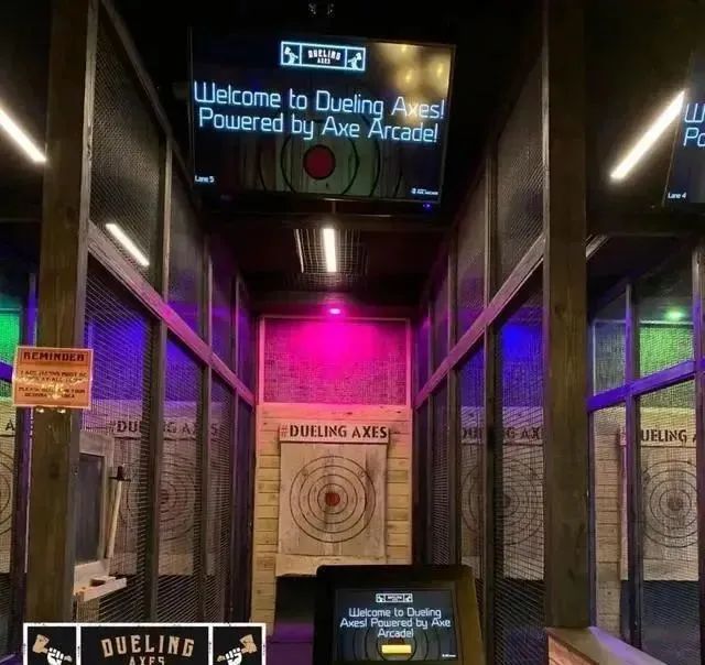 在 Dueling Axes 可以滿足你原始的野性:扔斧頭。從你聽到?jīng)Q斗場的第一聲“砰”的那刻起,你肯定會被下面的場景深深吸引。決斗場設(shè)有18條投擲道,每個投擲道最多可容納6名參與者,一間私人貴賓室,以及一個開放式雞尾酒吧。