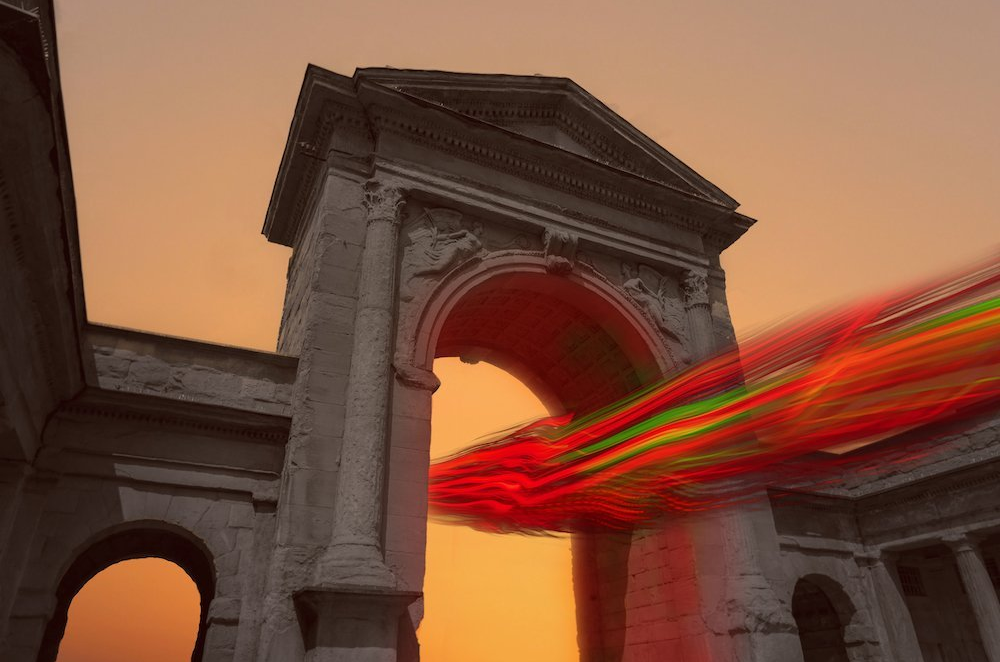 裝置被反射材料包裹。白天,古典的拱廊、流動(dòng)的天空、樹影和草茵被投影在表面之上,物體與環(huán)境的界限變得模糊,裝置本身也成為永動(dòng)的藝術(shù)。夜幕降臨,裝置變得透明且空靈,燈光矩陣呈現(xiàn)出極具未來(lái)感的氣質(zhì)。“動(dòng)量”將虛擬藝術(shù)與實(shí)體裝置相結(jié)合。AR 增強(qiáng)現(xiàn)實(shí)技術(shù)打破了時(shí)空壁壘,觀眾可通過(guò)社交媒體上的按鈕,自發(fā)創(chuàng)作,讓數(shù)個(gè)以裝置“動(dòng)量”為原型的反光立方體漂浮于不同場(chǎng)域的鏡頭下。