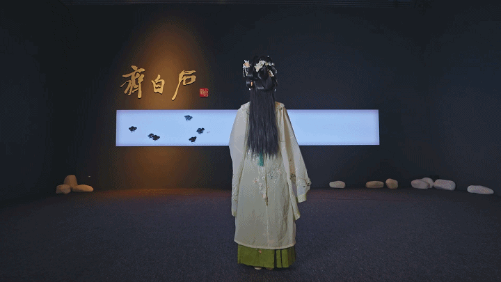 運用數(shù)字化技術(shù)合成并重構(gòu)白石老人的藝術(shù)世界,通過藝術(shù)情景的融合,讓觀眾沉浸在特定空間內(nèi),將齊白石筆下之物一一活化。借助數(shù)字藝術(shù)的特點,我們得以跨越時間的維度,與齊白石燦爛的文化遺產(chǎn)重啟對話。這一場傳統(tǒng)文化與數(shù)字藝術(shù)的相遇,連接傳統(tǒng)與時代,讓文化跨越時空,重新煥發(fā)現(xiàn)代活力。