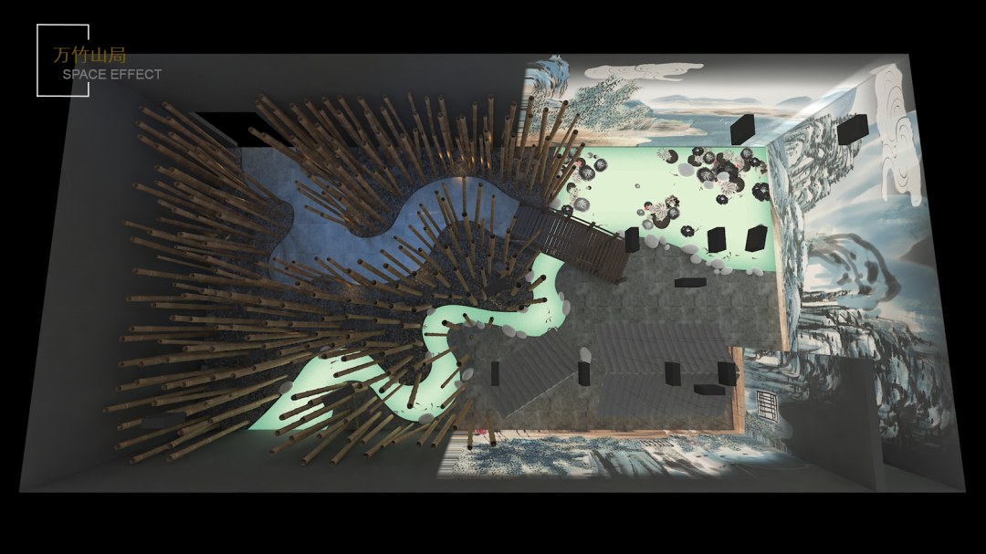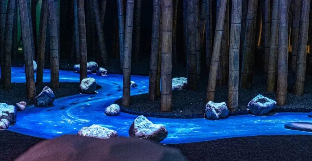 藝術(shù)團隊通過虛實結(jié)合創(chuàng)意,呈現(xiàn)齊白石的視覺記憶。通過竹林造景和霧森,打造圖中竹林意向。參觀者穿行于一片疏密有章的竹林,竹壁上動態(tài)呈現(xiàn)出白石老人不同時期的書法作品,竹林深處潺潺流水聲、鳥鳴聲間或傳來。