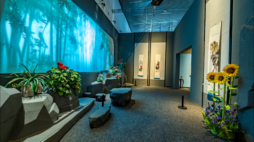 觀眾步入序廳,首先看到的是正對墻面上齊白石作品的數(shù)字化影像。藝術(shù)團隊提取齊白石藝術(shù)畫作中的元素,通過藝術(shù)化的手法進行重新組合,利用高清LED屏幕成像,通過裸眼3D視覺影像呈現(xiàn)。裸眼3D效果的魚蝦三維影像作為動線引導,由右側(cè)入口進入第一個單元:萬竹山居。