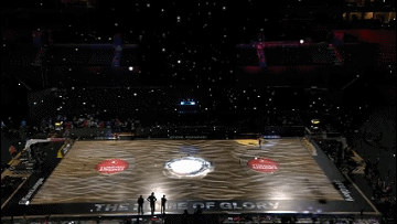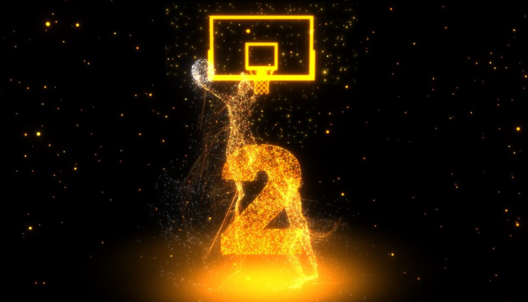 粒子運(yùn)動軌跡組成兩名身材高大的球員,他們以帥氣的投籃動作霸屏球場。讓觀眾迫不及待想要看到球員們在賽場上奔跑、投籃的樣子。