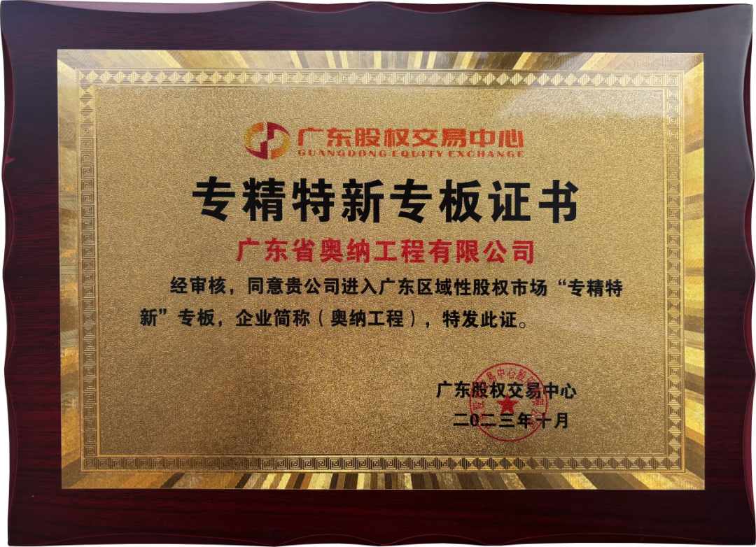 2022年,廣東省奧納工程有限公司被認定為“廣東省專精特新企業(yè)”。奧納工程公司獲得這一殊榮,意味著企業(yè)在技術(shù)創(chuàng)新、管理創(chuàng)新和市場拓展方面取得了優(yōu)異成績,是市場對公司實力的高度認可。而今,奧納工程成功掛牌。