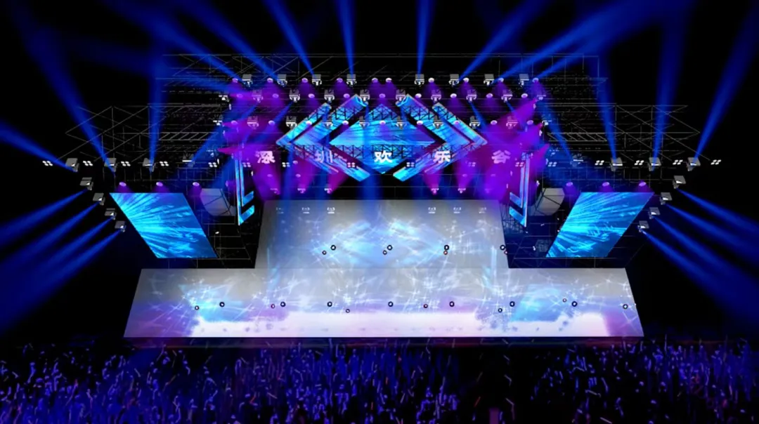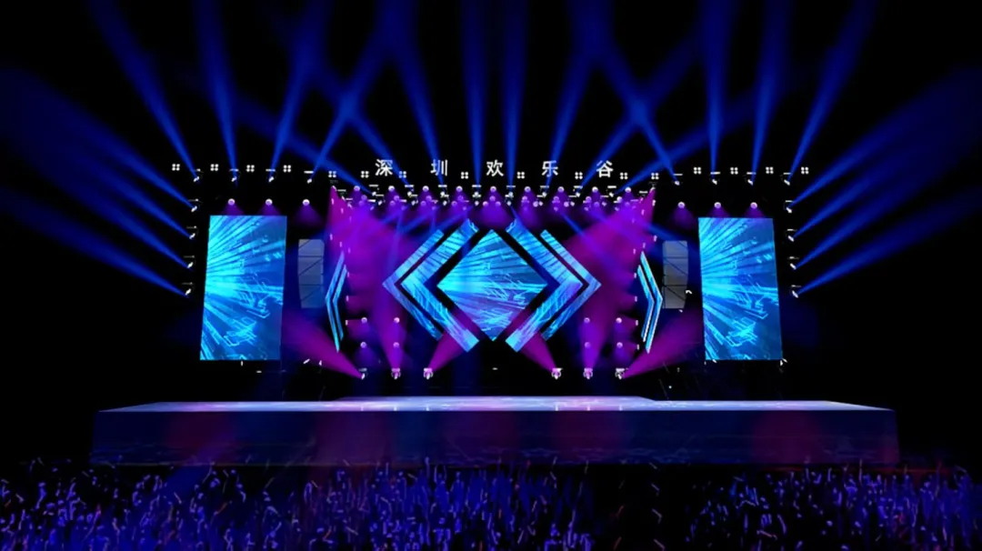 本次舞臺(tái)布置在陽(yáng)光海岸,舞美設(shè)計(jì)的主題圍繞“深圳歡樂(lè)谷夏浪音樂(lè)節(jié)”展開(kāi),旨在營(yíng)造一個(gè)充滿活力、激情和創(chuàng)意的舞臺(tái)效果,讓觀眾沉浸在音樂(lè)與視覺(jué)的雙重盛宴中。舞臺(tái)設(shè)計(jì)注重層次感,通過(guò)不同高度的平臺(tái)和結(jié)構(gòu),營(yíng)造出一種立體的視覺(jué)效果,舞臺(tái)中央的屏幕和燈光裝置較高,兩側(cè)逐漸降低,形成一種自然的視覺(jué)引導(dǎo)。主色調(diào)選用了粉色和紫色,這兩種顏色不僅具有強(qiáng)烈的視覺(jué)沖擊力,還能傳達(dá)出一種夢(mèng)幻和浪漫的感覺(jué),符合夏日音樂(lè)節(jié)的氛圍。輔助色調(diào)搭配白色和藍(lán)色的燈光,增加了舞臺(tái)的層次感和深度,使整體視覺(jué)效果更加豐富。